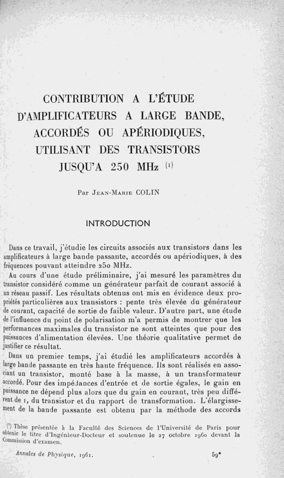Contribution à l'étude d'amplificateurs à large bande, accordés ou apériodiques, utilisant des transistors jusqu'à 250 MHz